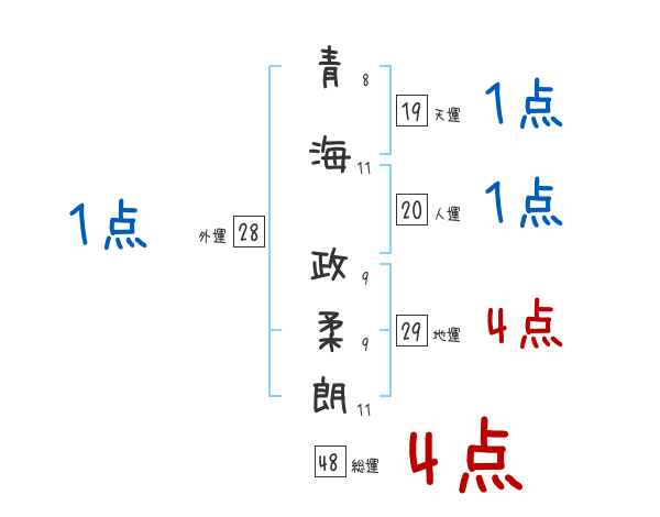 天運![]() | 青海政柔朗さんの天運は19画の1つ星!優れた才能を持ちますが、協調性が足りないことも。周りの人と協力する事を意識しましょう。 家系が持つ宿命的な運勢を表します。祖先から受け継いだ苗字ですので自分の力が及びません。家柄を象徴します。 |