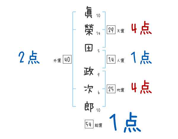 天運![]() | 眞榮田政次郎さんの天運は29画の4つ星!完全主義で才能がある。厳格な心の持ち主。 家系が持つ宿命的な運勢を表します。祖先から受け継いだ苗字ですので自分の力が及びません。家柄を象徴します。 |