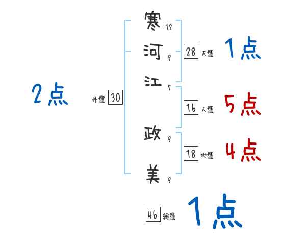 天運![]() | 寒河江政美さんの天運は28画の1つ星!家庭環境に注意。スポーツで活躍できる能力があるかも。 家系が持つ宿命的な運勢を表します。祖先から受け継いだ苗字ですので自分の力が及びません。家柄を象徴します。 |
