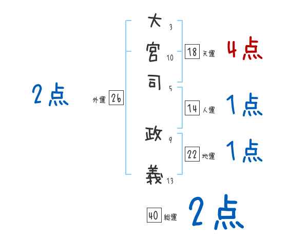 天運![]() | 大宮司政義さんの天運は18画の4つ星!情熱的で剛気。忍耐力があり信頼される。 家系が持つ宿命的な運勢を表します。祖先から受け継いだ苗字ですので自分の力が及びません。家柄を象徴します。 |