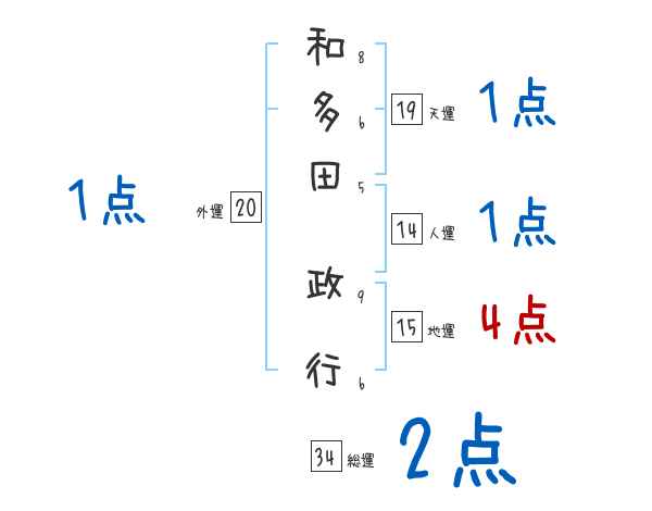総運![]() | 和多田政行さんの総運は34画の2つ星!独創性に優れるが、自尊心が強く災難に注意しましょう。 あなたの人生を表す1番重要な運勢です。生涯を通じて影響する総合運となり、主に50歳以降の晩年期に影響を及ぼします。 |