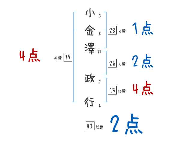 外運![]() | 小金澤政行さんの外運は17画の4つ星!積極的な行動力。地位を気づき財産を手に入れる。純粋な心と直感力。 生活面を象徴する運勢です。外部から受ける影響力を表し、結婚運、家庭運や職場、環境への順応性を表します。 |