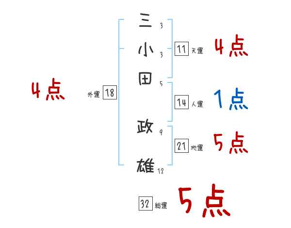 総運![]() | 三小田政雄さんの総運は32画の5つ星!柔軟性があり成功する。チャンスが多く金運が良い。 あなたの人生を表す1番重要な運勢です。生涯を通じて影響する総合運となり、主に50歳以降の晩年期に影響を及ぼします。 |