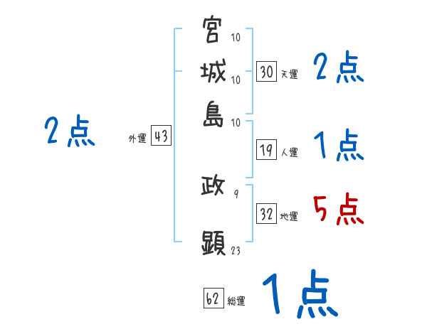 天運![]() | 宮城島政顕さんの天運は30画の2つ星!浮き沈みの激しさに注意しましょう。 家系が持つ宿命的な運勢を表します。祖先から受け継いだ苗字ですので自分の力が及びません。家柄を象徴します。 |