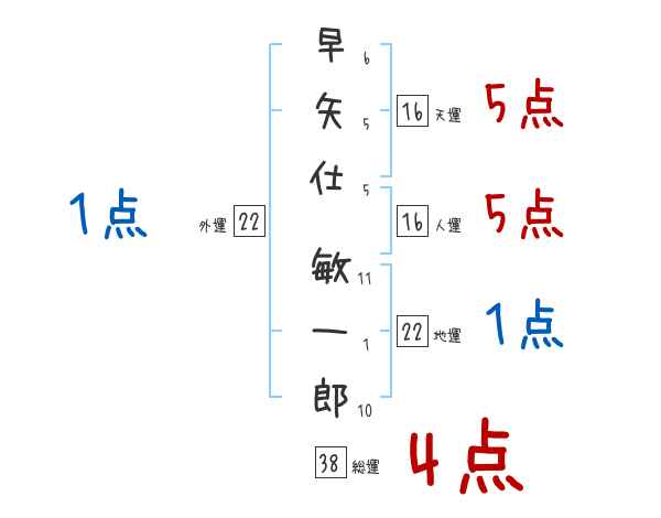 天運![]() | 早矢仕敏一郎さんの天運は16画の5つ星!人望が厚く大きく発展する。逆転成功が見える。 家系が持つ宿命的な運勢を表します。祖先から受け継いだ苗字ですので自分の力が及びません。家柄を象徴します。 |