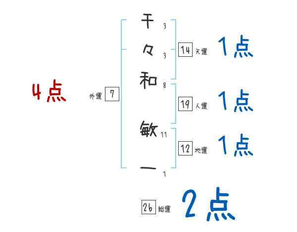 人運![]() | 千々和敏一さんの人運は19画の1つ星!優れた才能を持ちますが、協調性が足りないことも。周りの人と協力する事を意識しましょう。 性格や才能などを表す2番目に重要な運勢です。人間関係や協調性、社会的な成功に影響します。主に20歳から50歳ぐらいまでの中年期の運勢を表します。 |