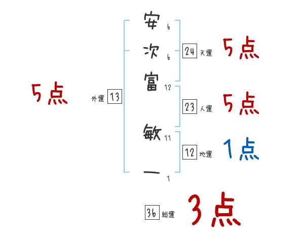 天運![]() | 安次富敏一さんの天運は24画の5つ星!家庭運が良く順調な人生。金運にも恵まれる。 家系が持つ宿命的な運勢を表します。祖先から受け継いだ苗字ですので自分の力が及びません。家柄を象徴します。 |
