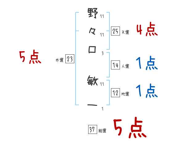 天運![]() | 野々口敏一さんの天運は25画の4つ星!個性があり才能があふれる。強運の持ち主で発展する。 家系が持つ宿命的な運勢を表します。祖先から受け継いだ苗字ですので自分の力が及びません。家柄を象徴します。 |