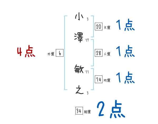 総運![]() | 小澤敏之さんの総運は34画の2つ星!独創性に優れるが、自尊心が強く災難に注意しましょう。 あなたの人生を表す1番重要な運勢です。生涯を通じて影響する総合運となり、主に50歳以降の晩年期に影響を及ぼします。 |