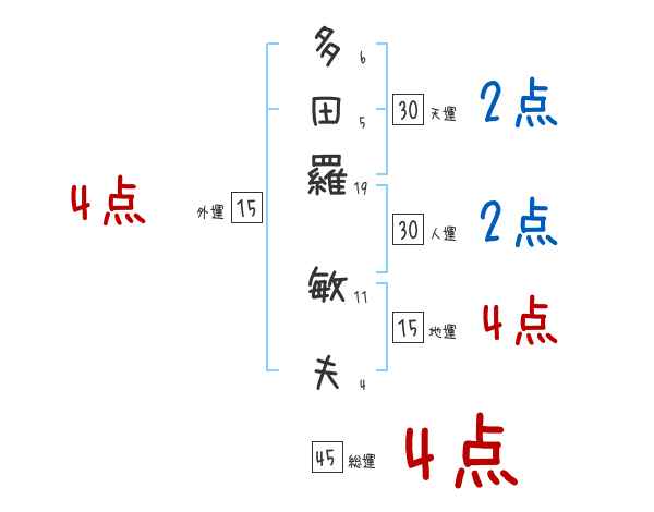 総運![]() | 多田羅敏夫さんの総運は45画の4つ星!もくもくと物事を進め達成する。地味な努力家。 あなたの人生を表す1番重要な運勢です。生涯を通じて影響する総合運となり、主に50歳以降の晩年期に影響を及ぼします。 |