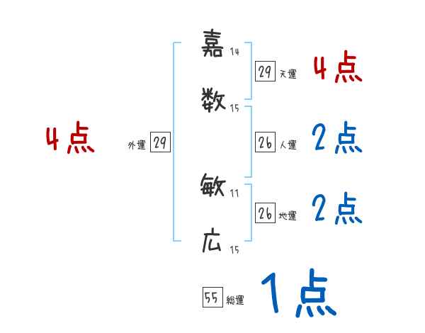 外運![]() | 嘉数敏広さんの外運は29画の4つ星!完全主義で才能がある。厳格な心の持ち主。 生活面を象徴する運勢です。外部から受ける影響力を表し、結婚運、家庭運や職場、環境への順応性を表します。 |