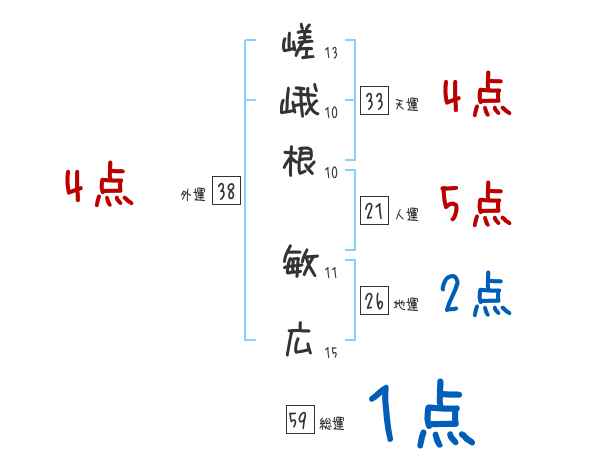 天運![]() | 嵯峨根敏広さんの天運は33画の4つ星!権力志向でプライドが高い。勇気があり運を切り開き成功する。 家系が持つ宿命的な運勢を表します。祖先から受け継いだ苗字ですので自分の力が及びません。家柄を象徴します。 |