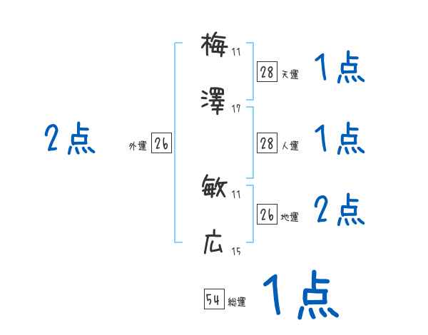 総運![]() | 梅澤敏広さんの総運は54画の1つ星!トラブルが多いかも。周りをよく見て協調して過ごしましょう。 あなたの人生を表す1番重要な運勢です。生涯を通じて影響する総合運となり、主に50歳以降の晩年期に影響を及ぼします。 |