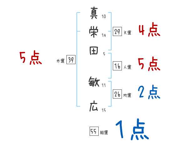 外運![]() | 真栄田敏広さんの外運は39画の5つ星!社交性に優れ人望が厚い。人の上に立ち成功する。 生活面を象徴する運勢です。外部から受ける影響力を表し、結婚運、家庭運や職場、環境への順応性を表します。 |