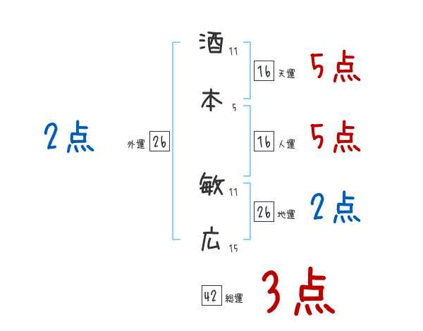 人運![]() | 酒本敏広さんの人運は16画の5つ星!人望が厚く大きく発展する。逆転成功が見える。 性格や才能などを表す2番目に重要な運勢です。人間関係や協調性、社会的な成功に影響します。主に20歳から50歳ぐらいまでの中年期の運勢を表します。 |