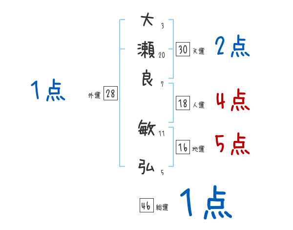 天運![]() | 大瀬良敏弘さんの天運は30画の2つ星!浮き沈みの激しさに注意しましょう。 家系が持つ宿命的な運勢を表します。祖先から受け継いだ苗字ですので自分の力が及びません。家柄を象徴します。 |