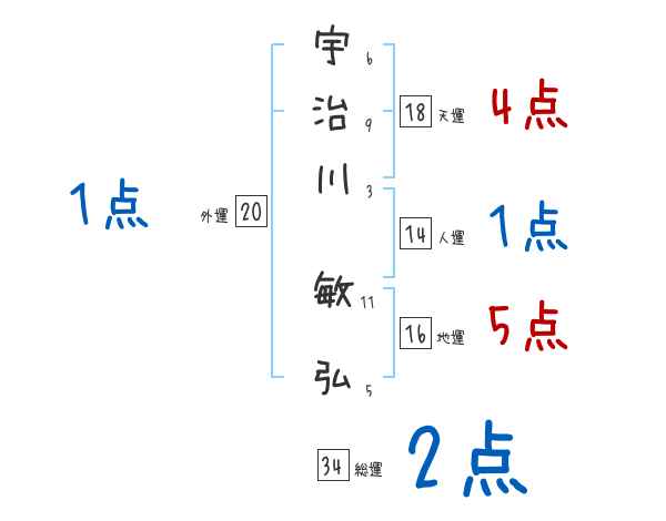 天運![]() | 宇治川敏弘さんの天運は18画の4つ星!情熱的で剛気。忍耐力があり信頼される。 家系が持つ宿命的な運勢を表します。祖先から受け継いだ苗字ですので自分の力が及びません。家柄を象徴します。 |