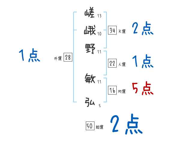 人運![]() | 嵯峨野敏弘さんの人運は22画の1つ星!努力することが苦手ないっぽう手先が器用。芸術性にも優れる。 性格や才能などを表す2番目に重要な運勢です。人間関係や協調性、社会的な成功に影響します。主に20歳から50歳ぐらいまでの中年期の運勢を表します。 |