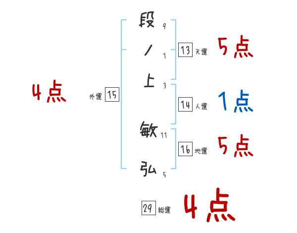 総運![]() | 段ノ上敏弘さんの総運は29画の4つ星!完全主義で才能がある。厳格な心の持ち主。 あなたの人生を表す1番重要な運勢です。生涯を通じて影響する総合運となり、主に50歳以降の晩年期に影響を及ぼします。 |