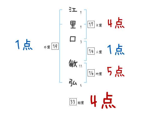総運![]() | 江里口敏弘さんの総運は33画の4つ星!権力志向でプライドが高い。勇気があり運を切り開き成功する。 あなたの人生を表す1番重要な運勢です。生涯を通じて影響する総合運となり、主に50歳以降の晩年期に影響を及ぼします。 |