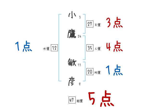 人運![]() | 小鷹敏彦さんの人運は35画の4つ星!温厚な性格で感受性が高い。穏和な性格で人望が厚い。 性格や才能などを表す2番目に重要な運勢です。人間関係や協調性、社会的な成功に影響します。主に20歳から50歳ぐらいまでの中年期の運勢を表します。 |