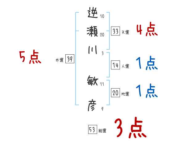 外運![]() | 逆瀬川敏彦さんの外運は39画の5つ星!社交性に優れ人望が厚い。人の上に立ち成功する。 生活面を象徴する運勢です。外部から受ける影響力を表し、結婚運、家庭運や職場、環境への順応性を表します。 |