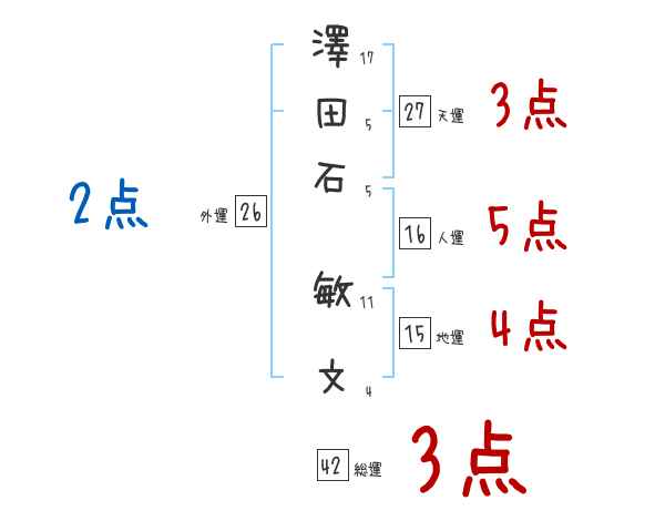 人運![]() | 澤田石敏文さんの人運は16画の5つ星!人望が厚く大きく発展する。逆転成功が見える。 性格や才能などを表す2番目に重要な運勢です。人間関係や協調性、社会的な成功に影響します。主に20歳から50歳ぐらいまでの中年期の運勢を表します。 |
