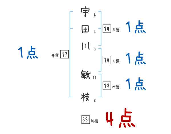 外運![]() | 宇田川敏枝さんの外運は19画の1つ星!優れた才能を持ちますが、協調性が足りないことも。周りの人と協力する事を意識しましょう。 生活面を象徴する運勢です。外部から受ける影響力を表し、結婚運、家庭運や職場、環境への順応性を表します。 |