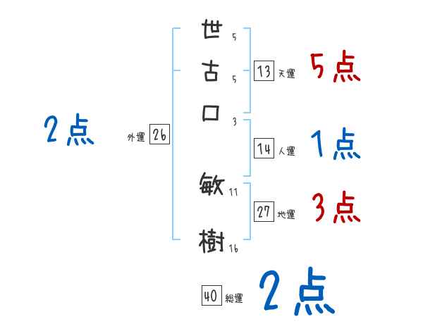 外運![]() | 世古口敏樹さんの外運は26画の2つ星!波瀾万丈かも。信頼できる人を大事にしましょう。 生活面を象徴する運勢です。外部から受ける影響力を表し、結婚運、家庭運や職場、環境への順応性を表します。 |