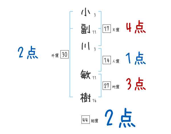 総運![]() | 小副川敏樹さんの総運は44画の2つ星!誠実で慎重な性格。物事を考えすぎないように注意しましょう。 あなたの人生を表す1番重要な運勢です。生涯を通じて影響する総合運となり、主に50歳以降の晩年期に影響を及ぼします。 |