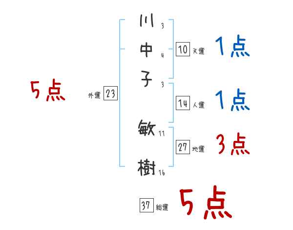 外運![]() | 川中子敏樹さんの外運は23画の5つ星!想像力に優れ活力がある。一代で成功し名誉を手に入れる。 生活面を象徴する運勢です。外部から受ける影響力を表し、結婚運、家庭運や職場、環境への順応性を表します。 |