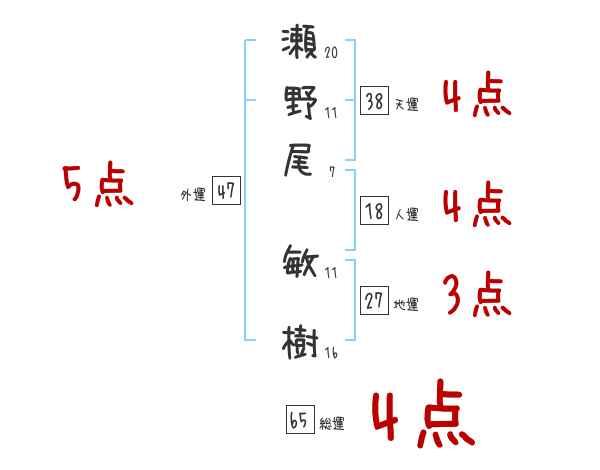 外運![]() | 瀬野尾敏樹さんの外運は47画の5つ星!実力が開花し発展する円満な人生。財に恵まれる。 生活面を象徴する運勢です。外部から受ける影響力を表し、結婚運、家庭運や職場、環境への順応性を表します。 |