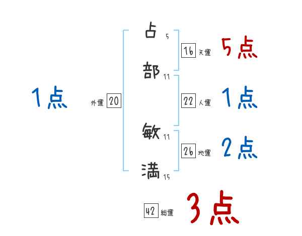 天運![]() | 占部敏満さんの天運は16画の5つ星!人望が厚く大きく発展する。逆転成功が見える。 家系が持つ宿命的な運勢を表します。祖先から受け継いだ苗字ですので自分の力が及びません。家柄を象徴します。 |