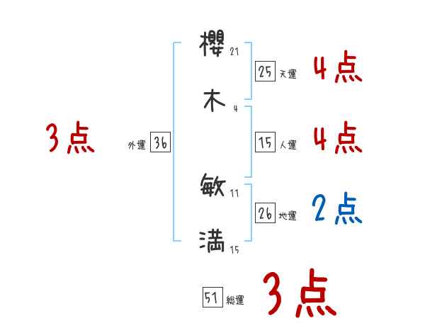外運![]() | 櫻木敏満さんの外運は36画の3つ星!先見性が豊かです。多少神経質で苦労することも。 生活面を象徴する運勢です。外部から受ける影響力を表し、結婚運、家庭運や職場、環境への順応性を表します。 |