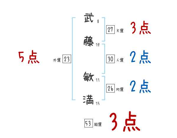 外運![]() | 武藤敏満さんの外運は23画の5つ星!想像力に優れ活力がある。一代で成功し名誉を手に入れる。 生活面を象徴する運勢です。外部から受ける影響力を表し、結婚運、家庭運や職場、環境への順応性を表します。 |
