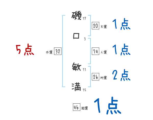 外運![]() | 磯口敏満さんの外運は32画の5つ星!柔軟性があり成功する。チャンスが多く金運が良い。 生活面を象徴する運勢です。外部から受ける影響力を表し、結婚運、家庭運や職場、環境への順応性を表します。 |