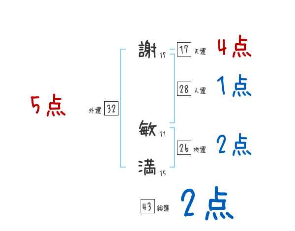 外運![]() | 謝敏満さんの外運は32画の5つ星!柔軟性があり成功する。チャンスが多く金運が良い。 生活面を象徴する運勢です。外部から受ける影響力を表し、結婚運、家庭運や職場、環境への順応性を表します。 |