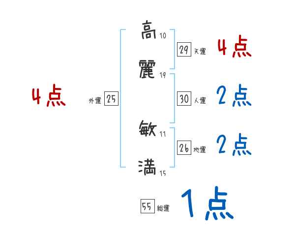 天運![]() | 高麗敏満さんの天運は29画の4つ星!完全主義で才能がある。厳格な心の持ち主。 家系が持つ宿命的な運勢を表します。祖先から受け継いだ苗字ですので自分の力が及びません。家柄を象徴します。 |