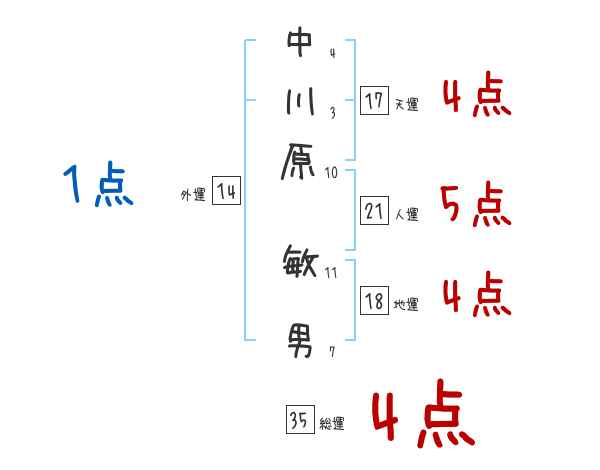 総運![]() | 中川原敏男さんの総運は35画の4つ星!温厚な性格で感受性が高い。穏和な性格で人望が厚い。 あなたの人生を表す1番重要な運勢です。生涯を通じて影響する総合運となり、主に50歳以降の晩年期に影響を及ぼします。 |