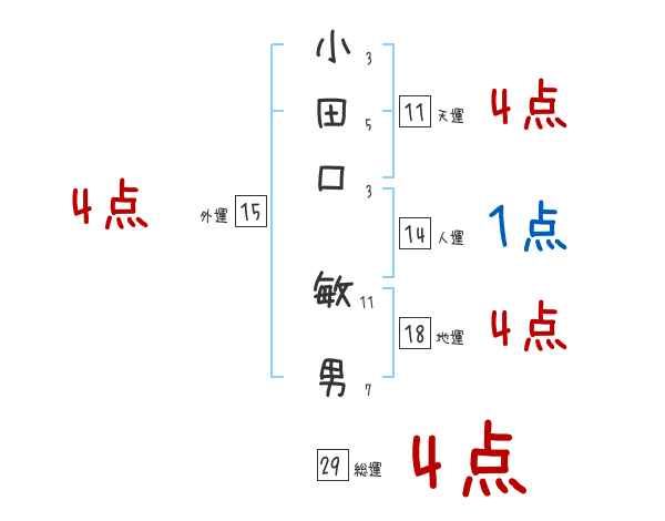 天運![]() | 小田口敏男さんの天運は11画の4つ星!着実に富や地位を得る幸運な人生。 家系が持つ宿命的な運勢を表します。祖先から受け継いだ苗字ですので自分の力が及びません。家柄を象徴します。 |