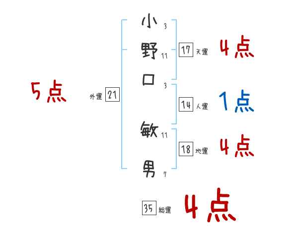 総運![]() | 小野口敏男さんの総運は35画の4つ星!温厚な性格で感受性が高い。穏和な性格で人望が厚い。 あなたの人生を表す1番重要な運勢です。生涯を通じて影響する総合運となり、主に50歳以降の晩年期に影響を及ぼします。 |