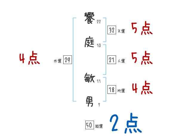 天運![]() | 饗庭敏男さんの天運は32画の5つ星!柔軟性があり成功する。チャンスが多く金運が良い。 家系が持つ宿命的な運勢を表します。祖先から受け継いだ苗字ですので自分の力が及びません。家柄を象徴します。 |