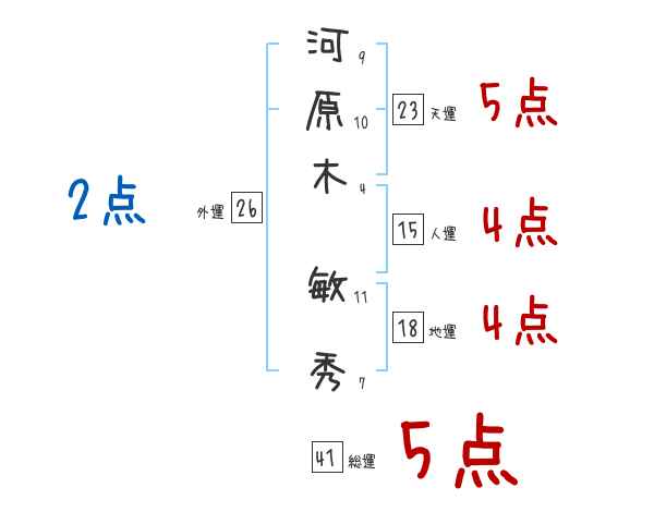 天運![]() | 河原木敏秀さんの天運は23画の5つ星!想像力に優れ活力がある。一代で成功し名誉を手に入れる。 家系が持つ宿命的な運勢を表します。祖先から受け継いだ苗字ですので自分の力が及びません。家柄を象徴します。 |