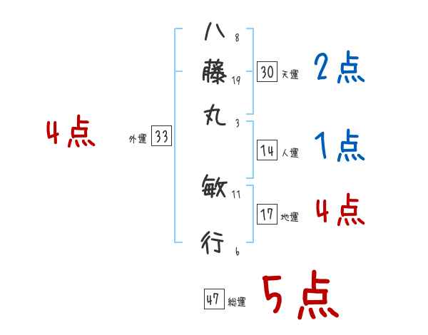 総運![]() | 八藤丸敏行さんの総運は47画の5つ星!実力が開花し発展する円満な人生。財に恵まれる。 あなたの人生を表す1番重要な運勢です。生涯を通じて影響する総合運となり、主に50歳以降の晩年期に影響を及ぼします。 |