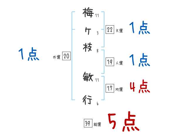 総運![]() | 梅ヶ枝敏行さんの総運は39画の5つ星!社交性に優れ人望が厚い。人の上に立ち成功する。 あなたの人生を表す1番重要な運勢です。生涯を通じて影響する総合運となり、主に50歳以降の晩年期に影響を及ぼします。 |