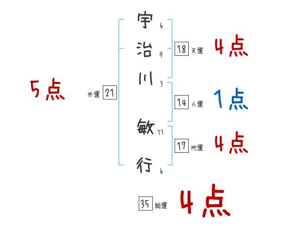 総運![]() | 宇治川敏行さんの総運は35画の4つ星!温厚な性格で感受性が高い。穏和な性格で人望が厚い。 あなたの人生を表す1番重要な運勢です。生涯を通じて影響する総合運となり、主に50歳以降の晩年期に影響を及ぼします。 |