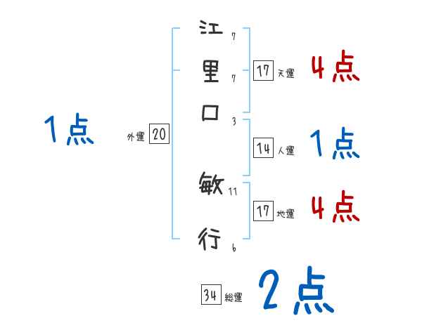 総運![]() | 江里口敏行さんの総運は34画の2つ星!独創性に優れるが、自尊心が強く災難に注意しましょう。 あなたの人生を表す1番重要な運勢です。生涯を通じて影響する総合運となり、主に50歳以降の晩年期に影響を及ぼします。 |