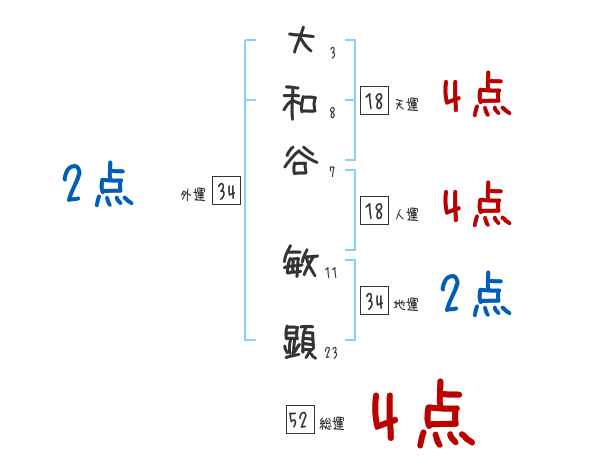 天運![]() | 大和谷敏顕さんの天運は18画の4つ星!情熱的で剛気。忍耐力があり信頼される。 家系が持つ宿命的な運勢を表します。祖先から受け継いだ苗字ですので自分の力が及びません。家柄を象徴します。 |
