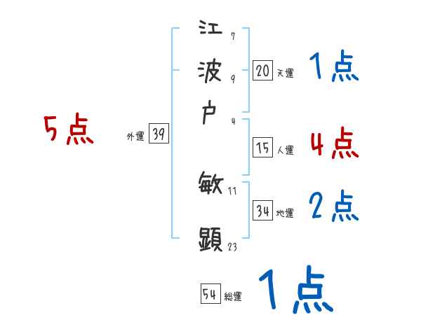 外運![]() | 江波戸敏顕さんの外運は39画の5つ星!社交性に優れ人望が厚い。人の上に立ち成功する。 生活面を象徴する運勢です。外部から受ける影響力を表し、結婚運、家庭運や職場、環境への順応性を表します。 |