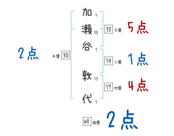 天運![]() | 加瀬谷敦代さんの天運は32画の5つ星!柔軟性があり成功する。チャンスが多く金運が良い。 家系が持つ宿命的な運勢を表します。祖先から受け継いだ苗字ですので自分の力が及びません。家柄を象徴します。 |